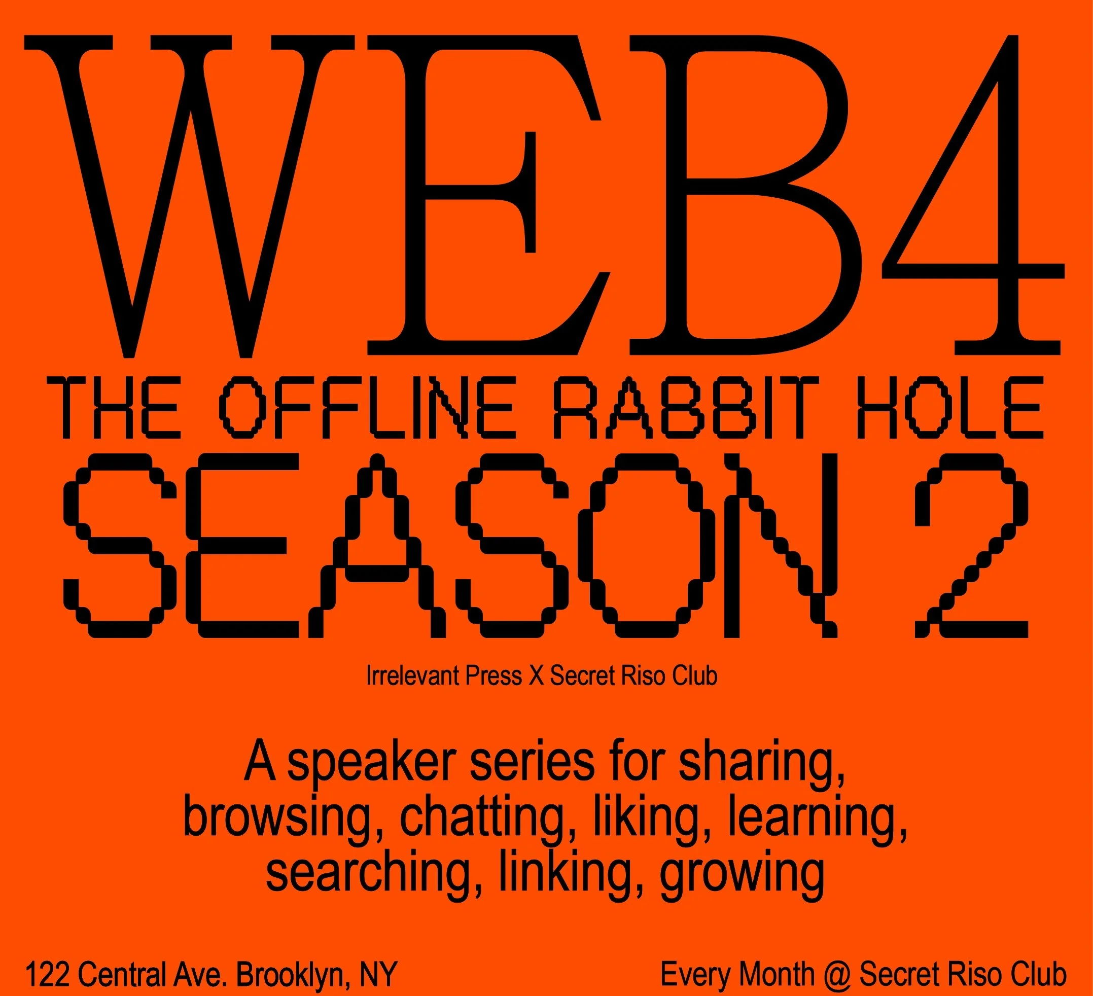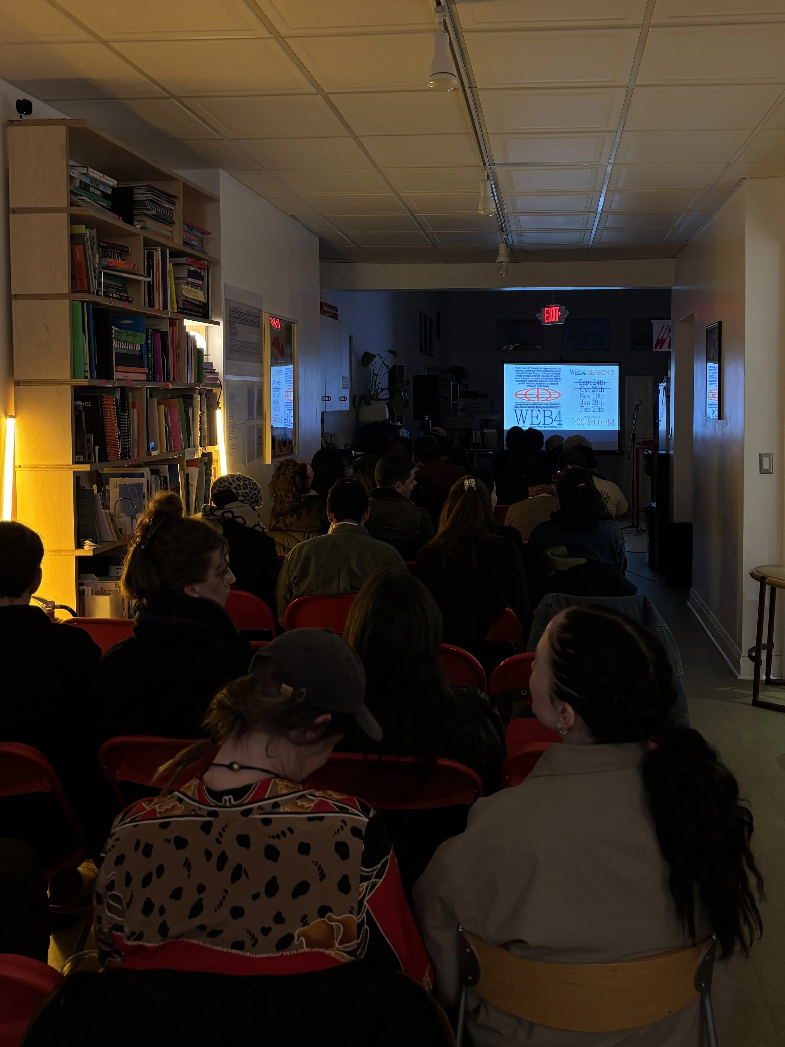 Web4: The Offline Rabbit Hole is a monthly speaker series that invites four presenters to showcase thoughts, research, or stories — their own offline rabbit holes — and invites audience members to provide feedback, questions, or paths for continued immersion.